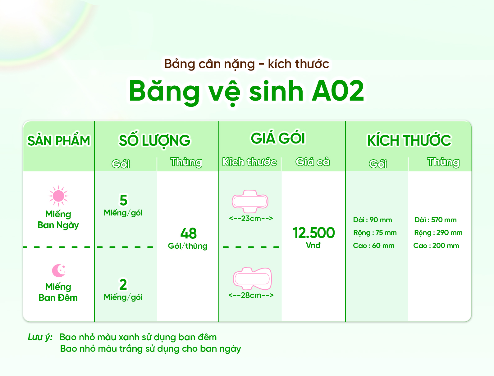 Bạn không cần lo lắng nên sử dụng loại nào cho ban ngày và loại nào cho ban đêm khi đã có A02. Được tích hợp cả hai loại ban ngày (23cm) và ban đêm (28cm). Tiện lợi và dễ sử dụng !
